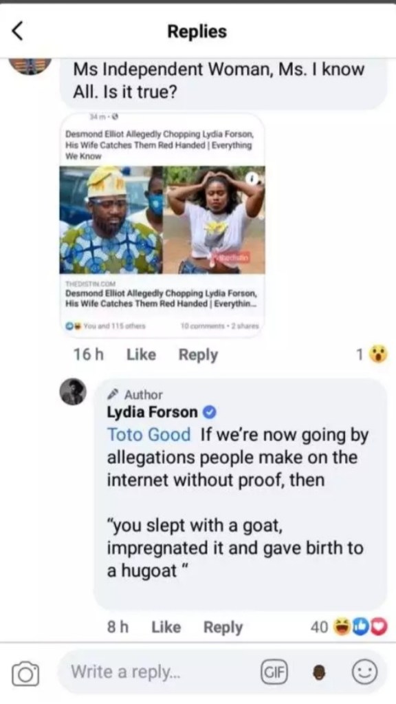 She wrote, ‘If we’re now going by allegations people make on the internet without proof, then“you slept with a goat, impregnated it and gave birth to a hugoat’